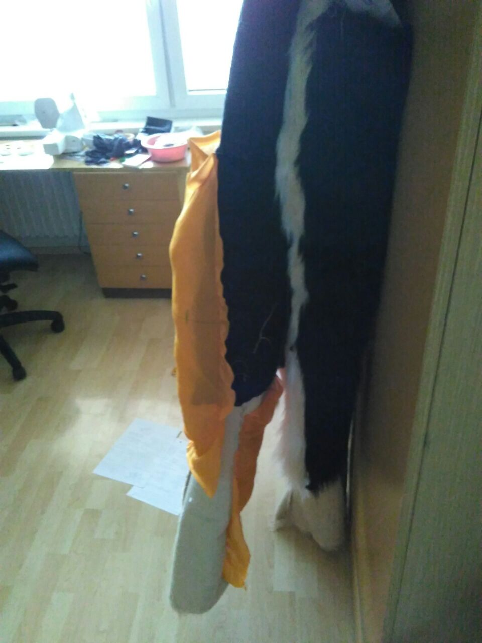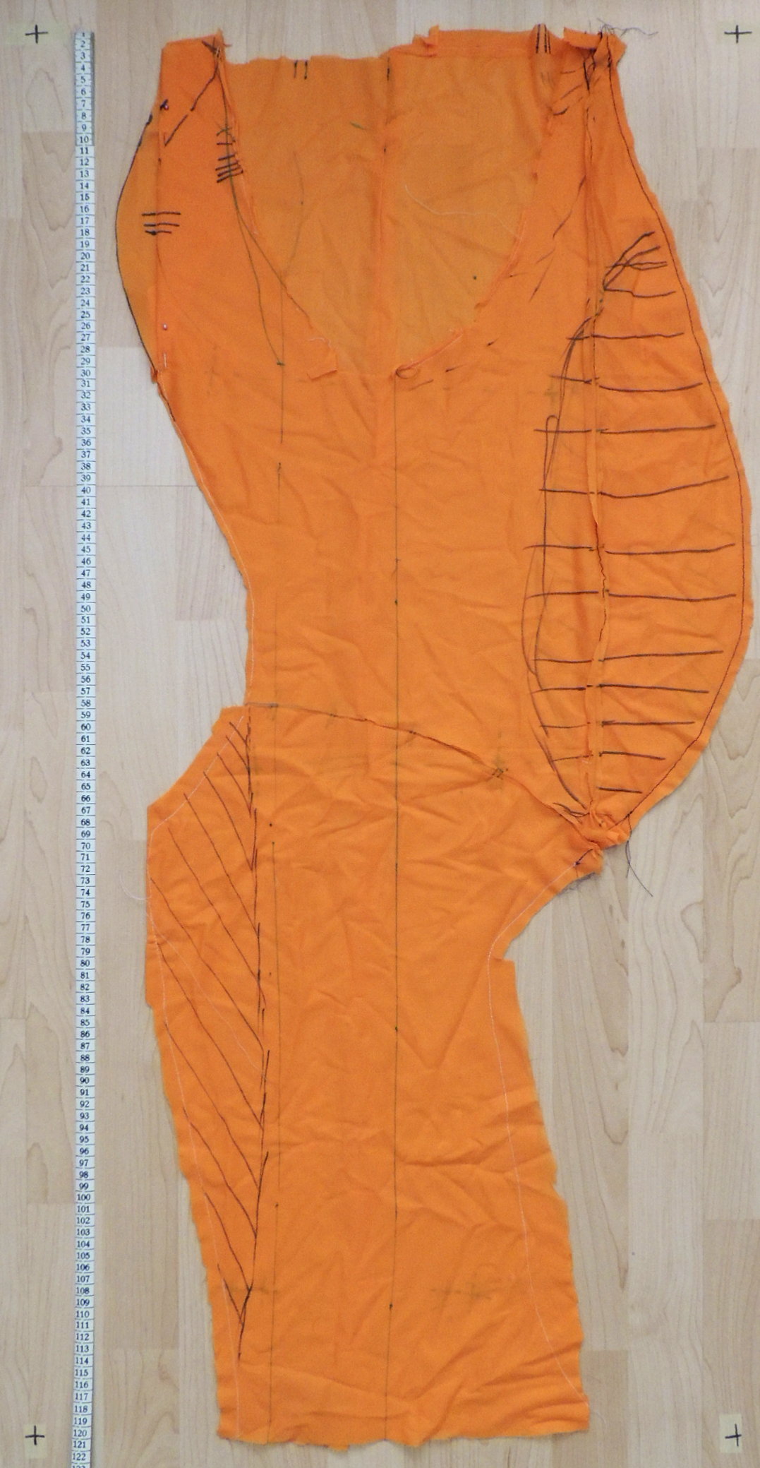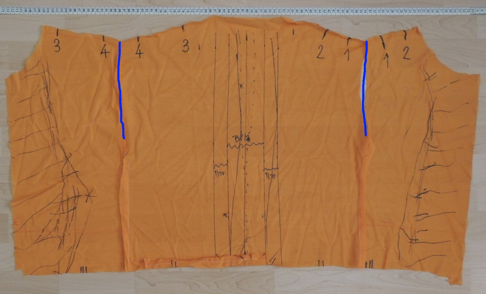 Zde je prototyp přímo překreslený z náčrtku výše - bez původně zamýšlený pohled z boku je použit jako šicí vzor bez korekcí (započítání látky po okrajích) - přesto se osvědčil.