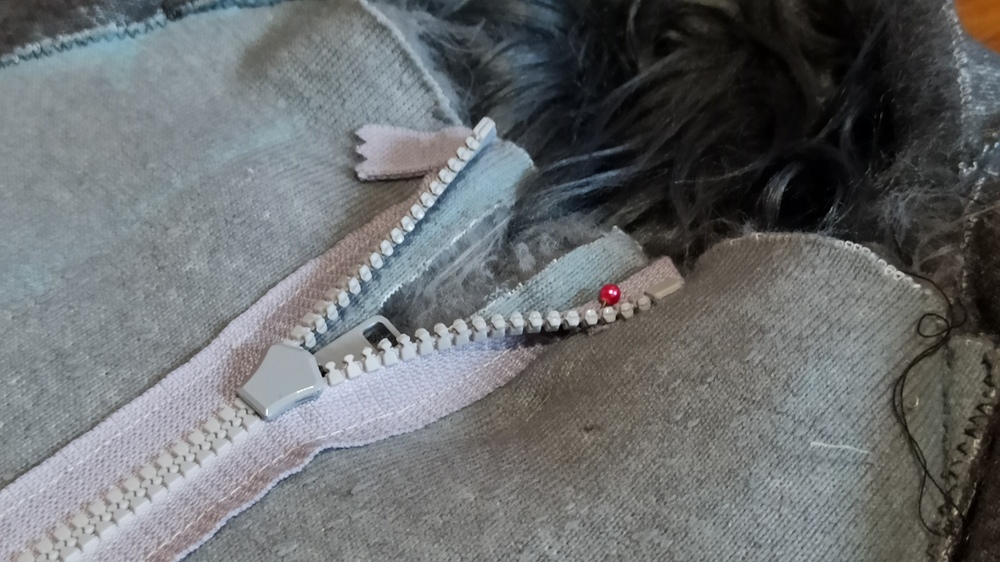Protože nechceme aby byl zip na srsti vidět, přišíváme ho k zadní části chlupatiny - chlupatinu nepřehýbáme, jak bychom to udělali u našívání zipu na běžné látky. Naopak ji necháme přečnívat až po okraj zipu, takže když zip zapneme a chlupatinu uhladíme, nebude zip vůbec vidět, najdeme ho spíš jen po hmatu - obzvláště pokud zip umístíme mezi dvě různě barevné chlupatiny.
