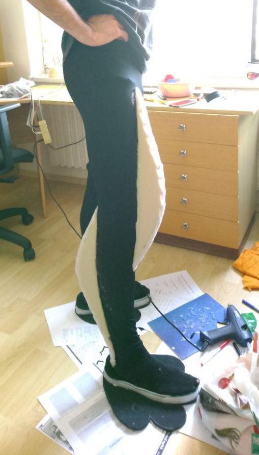 Podle obrázku jak má tvar nohy vypadat zboku vystřihujeme zaoblené trojúhelníky z molitanu a oblepujeme legíny.