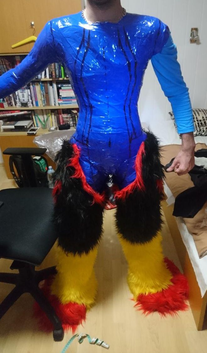 Po dokončení nohou (jakožto vycpané části bodysuitu) lze pokračovat oblepením zbytku postavy a opět vystříhat šicí vzory.